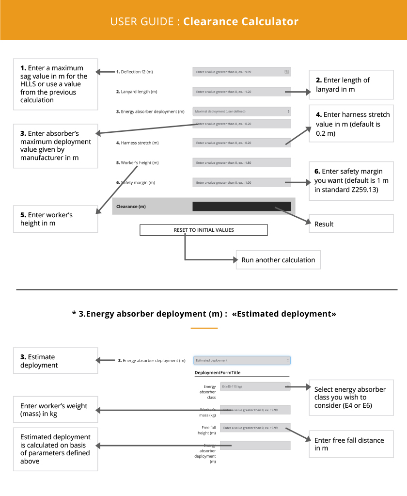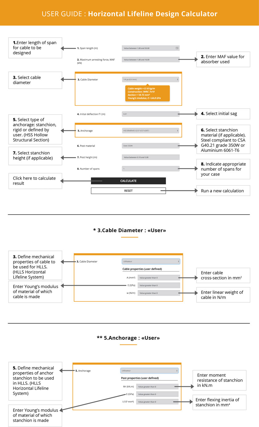 This tool has no legal or regulatory value. It is provided as an aid for engineers specializing in fall protection and for OHS officers and horizontal lifeline system (HLLS) users who wish to assess whether their HLLS installations are compliant. This tool is not a substitute for the opinion of a qualified engineer and must be used with caution. Only people with the appropriate knowledge and experience are qualified to use it.